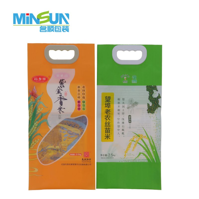 The China Manufacturer Wholesale Custom Food Packaging Handle Rice Bag from Guangdong Min Sun Environmental Protection Packaging Technology Co., Ltd. is designed to provide reliable, attractive, and safe packaging for rice and other food products. Built with high‑quality laminated materials and supported by advanced production technology, this packaging solution offers durability, convenience, and strong shelf appeal. It is suitable for retail brands, food processors, wholesalers, and businesses seeking customizable and professional rice packaging.